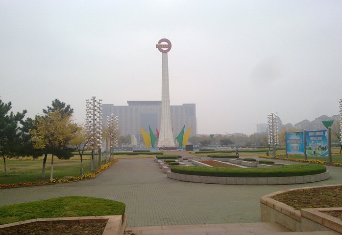 天地廣場(chǎng)位于煙臺(tái)經(jīng)濟(jì)技術(shù)開發(fā)區(qū)中心,北臨長(zhǎng)江路,南接珠江路,占地24萬平方米,1994年開工建設(shè),1998年竣工開放。廣場(chǎng)以綠為基調(diào),突出自然植物主體,點(diǎn)綴雕塑、小品等人工景物。中軸線將廣場(chǎng)分成南北兩個(gè)觀賞群,以表達(dá)天地廣場(chǎng)的含義。北為與“天”有意的“太陽”廣場(chǎng),中心向外采用放射狀道路,以形似陽光,南為與“地”有意的“大地”廣場(chǎng),中心圍以規(guī)劃的環(huán)狀道路,以形似大地。