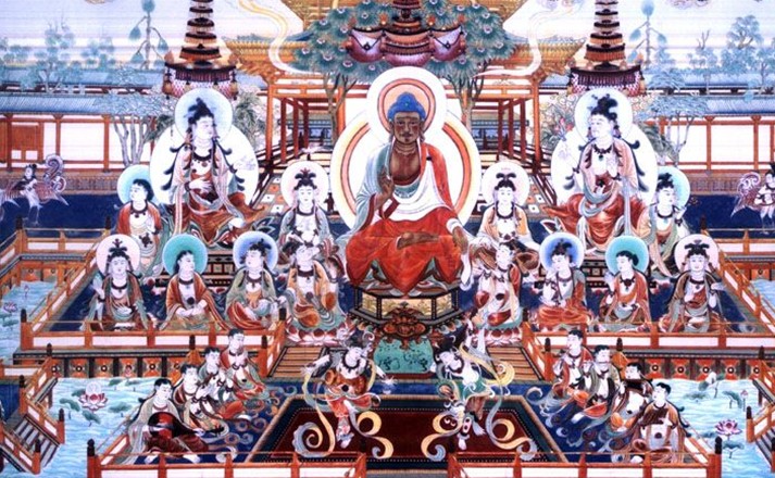 7窟前室東西壁南側(cè)繪兩幅《接引佛》。正中兩幅各4.5平方米的《說法圖》十分復(fù)雜,天上畫日月、翼人,靈山雷音寺中佛祖高坐蓮臺說法,左右兩側(cè)長廊下站立眾弟子,兩排使樂、天人奏樂,樂器有長蕭、排蕭、長笛、古箏、胡琴、銅磐、鐃鈸、云鑼、手鼓、大鼓等,是研究民族樂器發(fā)展歷史的重要資料。佛蓮臺前八德池中蓮花盛開,小樓內(nèi)僧人手扶橫木在撞鐘。人物栩栩如生,多達(dá)84身。圖中的大雄寶殿、亭臺樓閣結(jié)構(gòu)復(fù)雜,雄偉壯觀,是研究西夏民族建筑藝術(shù)風(fēng)格的珍貴資料。