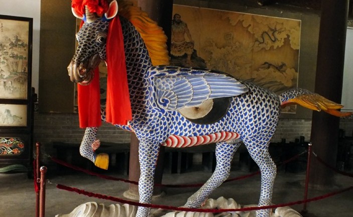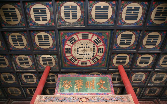 先天殿在中院月臺的當間部位。此殿異常宏大壯觀。看著它踞高凌空、莊重威嚴的風格,游人往往嘖嘖贊嘆。這座大殿通高二十六點七米,縱深十三點五米,面寬七間,通長二十六點四米,是一座典型的明代風格建筑。殿頂上覆琉璃簡瓦,正脊兩端亦施龍吻,垂脊、戧脊 施螭獸仙人。正脊中有橋亭火珠,脊面乃飾纏枝牡丹。其奇巧精致,耐人尋味。這座宮殿的門窗雕飾工藝,堪為上選藝術品,往往吸引不少游人,版權所有山東聊城聊之旅國際旅行社有限公司,轉載必究!由于為其精美的工藝所傾倒,而總是流連忘返。這些門窗,全系木質結構,上面鏤刻雕飾有金錢、艾葉、仙鶴、孔雀、蝙蝠、蝴蝶,還有二龍戲珠、鹿宿松下等圖案,花紋細密,栩栩如生,有很高的欣賞價值。入大殿內,即見一中心方柱似的神龕,這便是供奉伏羲塑像的地方。完高五米有余,上根懸掛"文明肇啟"匾額,系清代嘉慶年間秦州牧王賜均所書。匾文是對伏羲始創八卦、教民克愚的巨大功績的高度贊頌。