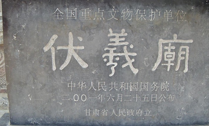 伏羲廟本名太昊宮,俗稱人宗廟,在甘肅省天水市城區西關伏羲路。一九六三年人民政府公布為甘肅省重點文物保護單位。伏羲廟臨街而建,院落重重相套,四進四院,宏闊幽深。廟內古建筑包括戲樓、牌坊、大門、儀門、先天殿、太極殿、鐘樓、鼓樓、來鶴廳共10座;新建筑有朝房、碑廊、展覽廳等共6座。新舊建筑共計76間。整個建筑群坐北朝南。牌坊、大門、儀門、先天殿、太極殿沿縱軸線依次排列,層層推進,莊嚴雄偉。