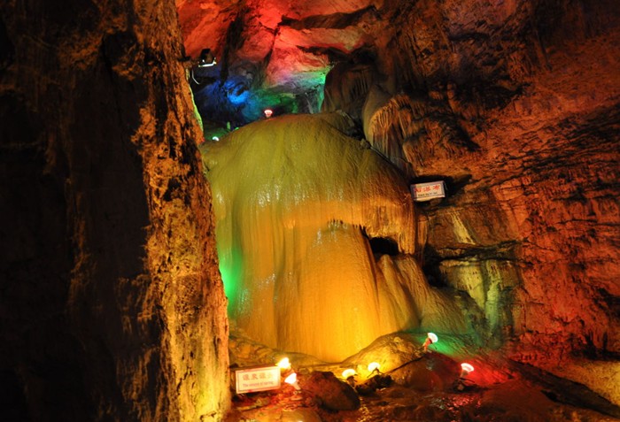 第五廳是“長(zhǎng)壽廳”。長(zhǎng)壽廳雄偉高大,高約25米,鐘乳石奇多。長(zhǎng)壽廳美,美在猶如天王托塔似的美麗彩色石筍,美在猶如桂林詩(shī)景般秀麗景象,美在猶如一個(gè)村莊,萬(wàn)家燈火,更美在猶如遠(yuǎn)古火山崩發(fā)一股熾熱火紅的巖漿。峭壁上石旗飄揚(yáng),白色瀑布頂部有一石化了的盒子,盒上刻有“金棒藏記”四字。這一人文景觀加海魚(yú)化石,為長(zhǎng)壽廳又增添了幾分神秘色彩。“源泉源頭”流出長(zhǎng)壽水,據(jù)說(shuō)喝了會(huì)健康長(zhǎng)壽。