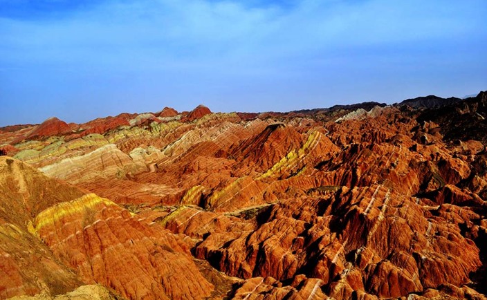 張掖丹霞地貌分布廣闊,場(chǎng)面壯觀,造型奇特,色彩艷麗,是我國干旱地區(qū)最典型和面積最大的丹霞地貌景觀,具有很高的科考價(jià)值和旅游觀賞價(jià)值。張掖的丹霞地貌集中分布在臨澤、肅南兩縣境內(nèi),面積達(dá)300多平方公里以上,是中國丹霞地貌發(fā)育最大最好、地貌造型最豐富的地區(qū)之一。層級(jí)錯(cuò)落交替、巖壁陡峭、氣勢(shì)磅礴、形態(tài)豐富、色彩班斕而稱奇,有七彩峽、七彩塔、七彩屏、七彩練、七彩湖、七彩大扇貝、火海、刀山等奇妙景觀令人不得不贊嘆大自然的鬼斧神工。