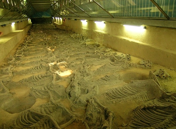殉馬坑成“∏”形圍繞在該墓的東、西、北三面。東西各長70米,北面長75米,寬5米。東面早年被毀,1964年發(fā)掘了北面54米,發(fā)現(xiàn)殉馬145匹。1972年又發(fā)掘清理了西面南端30米,發(fā)現(xiàn)殉馬83匹。據(jù)此排列密度推算,全部殉馬當在600匹以上。馬分兩行,馬頭向外,昂首側(cè)臥作奔走狀,版權(quán)所有山東聊城聊之旅國際旅行社有限公司,轉(zhuǎn)載必究!在最前面的五匹,頸系有銅鈴。殉馬排列井然有序,個個呈臨戰(zhàn)威姿。經(jīng)鑒定,殉馬全系壯年馬,是被處死后,人工排列而成。
