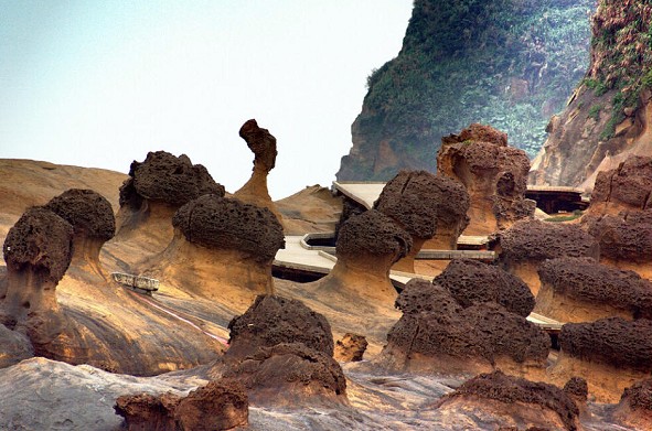 野柳風景區位于臺灣省基隆市西北方約15公里處的基金公路,是一突出海面的岬角(大屯山系),遠望如一只海龜蹣跚離岸,昂首拱背而游,因此也有人稱之為野柳龜。受造山運動的影響,深埋海底的沉積巖上升至海面,產生了附近海岸的單面山、海蝕崖、海蝕洞等地形,海蝕、風蝕等在不同硬度的巖層上作用,形成蜂窩巖、豆腐巖、蕈狀巖、姜狀巖,風化窗等世界級的巖層景觀。