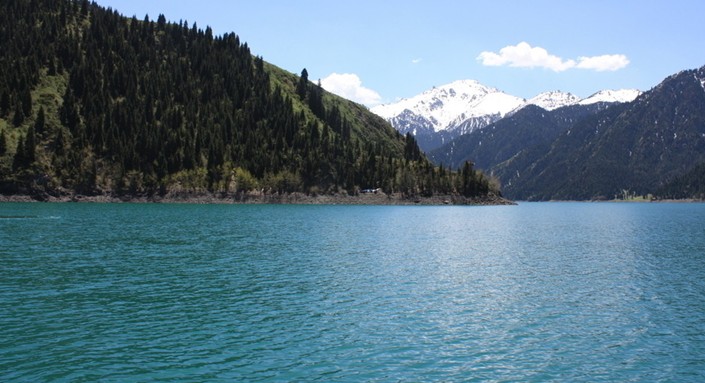 游天池可從烏魯木齊乘汽車前往,上山時山路蜿蜒曲折,伴隨一條奔騰的溪流,這是來自天池的水,清澈的溪水沖擊巖石時激起雪白的浪花,使人感到一股清新氣息。