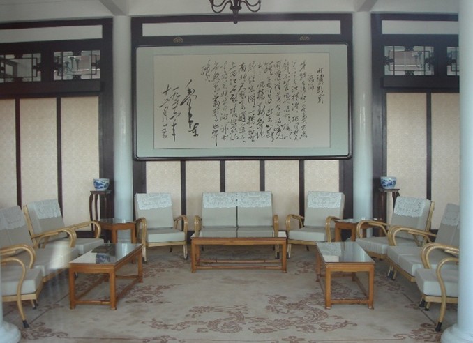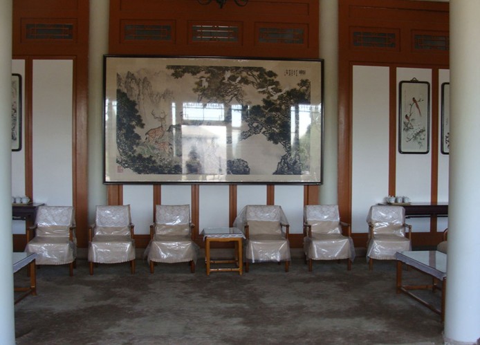 前客廳一共有五間房屋。靠東靠西的各一間用布簾與中間相隔,使中間三間室內(nèi)顯得靜謐祥和。周恩來接見外賓、會見客人等均在這中間三間房里舉行,周恩來一般坐在東邊主席位置上,西邊是主要客人的客席座位,會見時(shí)如用翻譯,就在后邊加上兩把椅子和一只小茶幾就行了。兩側(cè)是主要陪同人員坐位,如果隨行陪同人員太多,也可以臨時(shí)多放幾把椅子。周恩來在建國初期曾在這里會見原蘇聯(lián)駐中國大使羅申,原印尼總統(tǒng)蘇加諾等人。一般東側(cè)布簾內(nèi)的那間房子里放置有茶水、茶具。版權(quán)所有山東聊城聊之旅國際旅行社有限公司,轉(zhuǎn)載必究!這樣好方便工作人員隨時(shí)送上;西側(cè)布簾內(nèi)的那一間放置有小圓桌兩張。周恩來有時(shí)會見國內(nèi)外的知心客人或朋友時(shí),談到吃飯時(shí)間了,為了節(jié)省時(shí)間,也會讓工作人員在后邊簡易鍋灶上燒幾個(gè)菜招待客人,邊吃邊談,吃完飯繼續(xù)談。象越南的胡志明主席、柬埔寨的西哈努克親王、國內(nèi)的廖承志同志等都在大廳里和周恩來一起用過餐。