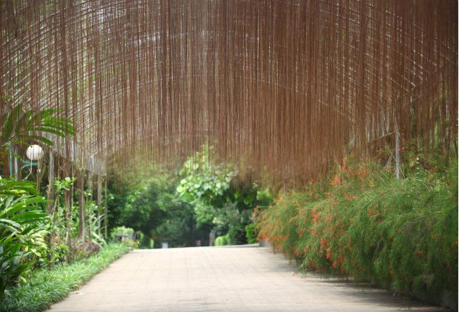 香草蘭試驗示范基地是植物園里的第二個展區。香草蘭是一種名貴的熱帶香料植物, 素有“食品香料之王”的美譽。香草蘭是藤本植物,它們生長在科研人員搭好的架子上,構成了一片綠蔭,架子下涼快通風,可見香草蘭跟人一樣,也喜歡涼快。