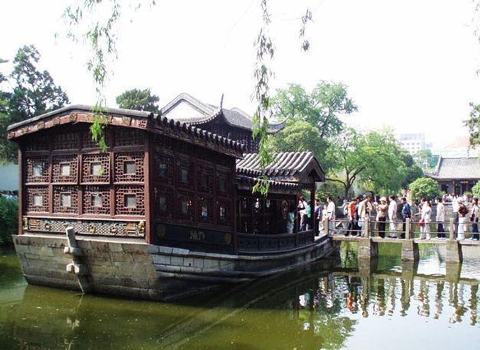 瓶形的水池是人工開鑿的,整個(gè)水池周長(zhǎng)約1866米,面積約占全園面積的一半多。池水清澈,水池四周全部用明代城磚駁岸,顯得非常古雅。水池的南端,有一座長(zhǎng)14.5米的仿木船式石肪。據(jù)說這座石舫是兩江總督尹繼善為了自己享樂,在清代乾隆十一年建造的。石舫上的“不系舟”匾額是當(dāng)年乾隆皇帝南巡時(shí)所題。中國(guó)有句古語: