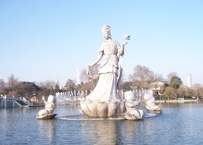 從玄武門開始,一條形如玉環的陸地,從南北兩面深入湖中,即為環洲。步入環洲,碧波拍浪。細柳依依,微風拂來,宛如煙云舒卷,故有“環洲煙柳”之稱。洲南端假山瀑布盡顯江南園林美感,石峰中有形似觀音的觀音石,是宋代花石綱的遺物。過觀音石,有東晉文學家郭璞的衣冠冢。洲北岸蓮花港畔有喇嘛廟、諾那塔、湖光塔影,獨具幽情。湖上還有月季園、兒童樂園、兒童友誼樂園、登月火箭等游樂點。