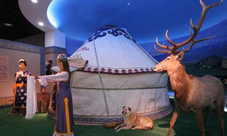 進入此展廳的同時觀眾就會被新疆獨具特色的民居風格和色彩絢爛的民族特色所吸引。在以維吾爾民居為主的中央主展廳,還配置了三個各具特色的哈薩克族,柯爾克孜族以及蒙古族的氈房,各種動物標本,猶如進入了一個遼闊的草原,時刻準備與游牧民族高歌,與游牧民族同飲的感覺油然而生。
