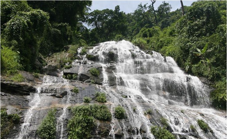 登上百花嶺觀瀑亭,便可欣賞到那直瀉的飛流,猶如飄拂的銀鏈懸掛在山間,呈三級(jí)跌宕瀉下,嘩嘩作響,周圍煙籠霧繞,景色奇特而壯觀。此瀑布因百花嶺而得名,其源頭在百花嶺的海拔700米的第二峰,含納眾匯,集水面近2平方公里。溪澗兩旁長(zhǎng)滿茂密的原始森林,地面積被層厚,地下潛流充足,長(zhǎng)年水流不歇,流水落差達(dá)300米,地勢(shì)跌宕,遂成三級(jí)飛瀑,而且一級(jí)一個(gè)景觀,各具特色。