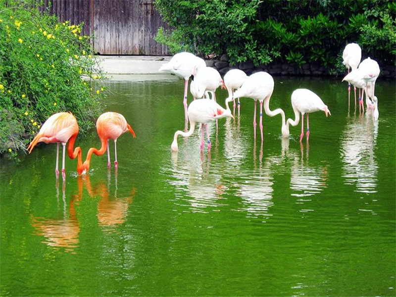 火烈鳥展區(qū)位于正大門口,共展出88只火烈鳥,有迎賓小姐的美稱,紅色的是美洲火烈鳥,粉紅色的是歐洲火烈鳥。它們有“Z”字形的長頸和鐮刀形的長嘴。此外它們還有一雙蜘蛛般的長腿,顏色發(fā)紅。它們有著獨特的淡朱紅色的羽毛。遠(yuǎn)遠(yuǎn)看去宛如一團(tuán)火球。所以又有“火鶴”之稱更奇特的是無論它們的羽毛如何美麗,一經(jīng)拔下就變成白色。它們的嘴和眼也生的與眾鳥不同:嘴細(xì)長彎曲向下,色多淡紅,基部為黃色,眼睛又細(xì)又瘦,與它們那龐大的身軀很不協(xié)調(diào)。