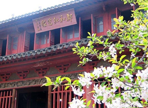 大門之內立有“鄭和故里”牌坊,其后,參天樹叢中掩映著鄭和紀念館,陳列有鄭和下西洋的碑文拓片、石刻以及航海用具等文物。