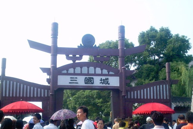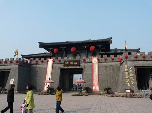 三國城坐落在蔥蘢蒼翠的軍嶂山麓、風景秀麗的太湖之濱,是中央電視臺為拍攝八十四集電視連續劇《三國演義》而興建的大型影視文化景區,“劉備招親”、“火燒赤壁”、“橫槊賦詩”、“草船借箭”、“借東風”、“諸葛吊孝”、“舌戰群儒”等十多集的重場戲均在此拍攝。它占地35公頃,是中視股份繼唐城景區之后推出的又一座集影視拍攝、旅游功能于一體的影視城。