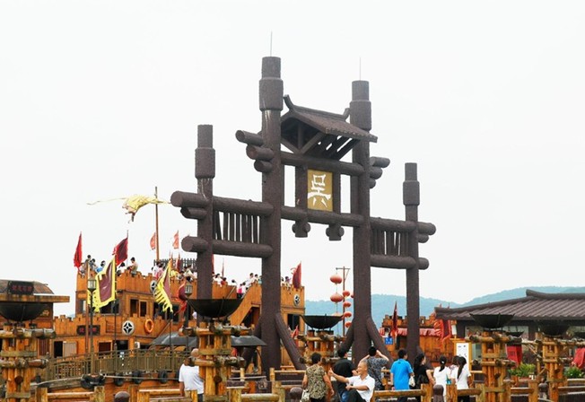 大道前方,豎立著三座高大的轅門,這就是曹營水旱寨了。它由曹操點將臺、轅門、四座敵樓和樓船組成,是《三國演義》中“火燒赤壁”、“橫槊賦詩”、“草船借箭”等戲的拍攝所在。曹操點將臺兩側,戰鼓矗立,版權所有山東聊城聊之旅國際旅行社有限公司,轉載必究!依稀可見一代梟雄曹公當年的威儀。站在三層高的點將臺上,極目遠眺,水寨風光盡收眼底。陸地上的樓臺堂榭與湖上的望江敵樓相峙對望,讓人驚嘆設計者的獨具匠心和建造者的巧奪天工。整個曹營還是“火燒赤壁”這場戲的拍攝地。據統計,在拍攝“火燒赤壁”這場戲時,就動用了九臺攝像機、一架直升機,從空中、陸地、水上同時進行拍攝。剎時,火光沖天,烈焰翻騰,東西綿延500米的曹營成為一片火海。曹營內,古樸雄偉的大轅門連接一條80米長、6米寬的甬道直通曹操樓船,三層高的樓船固定于湖面,游人扶舷撫艙之際,遙想1700多年前曹公躊躕滿志、橫槊賦詩的慷慨之情,頓生“是非成敗轉頭空”的滄桑之感。