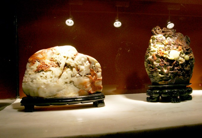 巴林奇石館館藏的“雞血石王”價值連城,雞血石王重34公斤,高51厘米,寬34.7厘米,厚27.4厘米,呈朱砂血紅,若雞血潑灑,鮮紅悅目,晶瑩欲滴,點點入石。此石墨赤分明,血色鮮艷欲滴,無論質地、斑紋、血色、光澤,凡上乘石料所具有的優秀品格都集于一身,身價近億元,是巴林奇石館的鎮館之寶。
