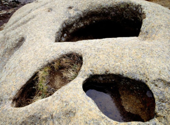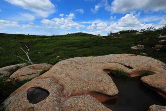 青山自然保護(hù)區(qū)位于海拔1574米的青山山體上,在山頂頂峰分布著各種各樣的冰臼,其平面上多數(shù)呈圓形、近圓形、橢圓形和不規(guī)則的形狀。有的象葫蘆,有的象梅花,有的象瓜子。一般冰臼口稍小,中下部較大,底多較平或呈鍋底微凹。形體“似臼”、“似盤”、“似盆”、“似匙”等,可以說應(yīng)有盡有。其中較深的冰臼多呈口小、肚大和底平特征。口部上緣帶有缺口(或開口),缺口有大有小,有深有淺。一般臼口寬約0.3~2米,深0.1~2米左右。最大的直徑達(dá)10.5米,深4.5米;最小的只有幾公分,似一般鈕扣大小。據(jù)調(diào)查統(tǒng)計(jì),在方圓不到2平方公里的范圍內(nèi),就有大小不一的冰臼1000多個(gè)。有的冰臼光潔如洗,無任何殘留物和充填物,但很多冰臼中,都填滿風(fēng)塵黃土物質(zhì),已長(zhǎng)滿花、草或喬木、灌木,形成大小不同的“天然盆景”,置于堅(jiān)硬平坦的花崗巖山脊上,十分壯觀,給人極大的神奇感和奧秘感。