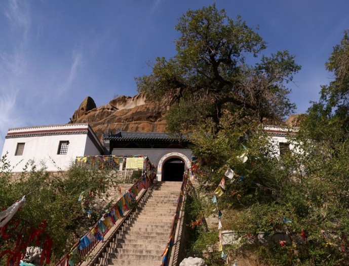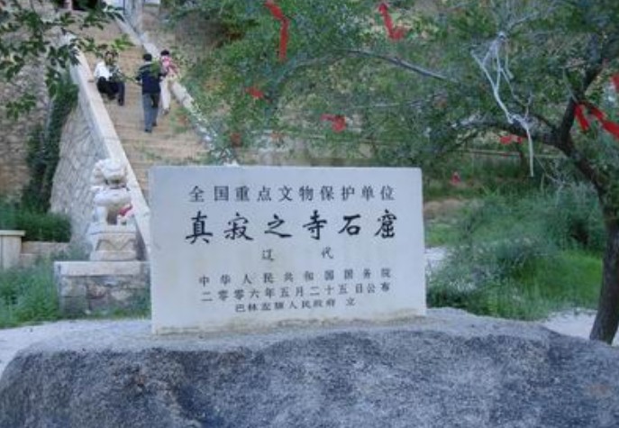 遼代石窟“真寂之寺”即林東后召廟石窟寺。其寺位于遼上京南15公里的山谷中。石窟開鑿在桃石山東南面陡壁上,分中、南、北三窟。窟前是清代續建的喇嘛廟“善福寺”。中窟眉額刻“真寂之寺”四個大字,當為遼代開鑿石窟的題名。“