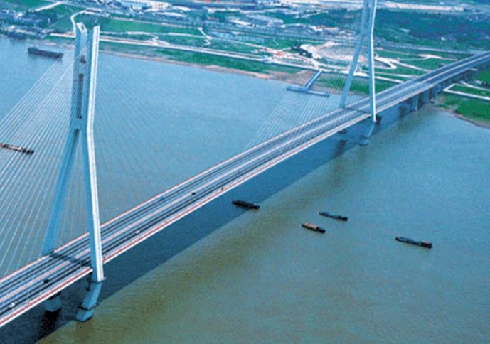 江陰長江公路大橋,懸索橋結構。主跨1385m。門式鋼筋混凝土塔柱,柱高193m,中設橫梁三道。為目前世界第6、中國第3大橋。94年開工建設,99年10月建成通車。