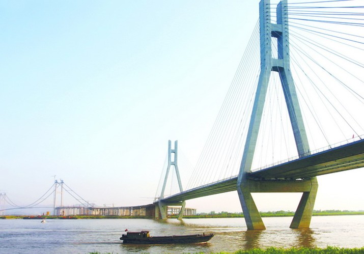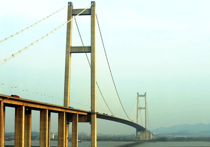 位于江蘇省鎮江、揚州兩市西側,為目前我國第一大跨徑的組合型橋梁,其建設過程中攻克多項世界性技術難題,當時是國內工程規模最大、建設標準最高、投資最大、技術最復雜、技術含量最高的現代化特大型橋梁工程,是我國第一座剛柔相濟的組合型橋梁。