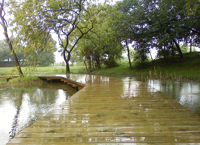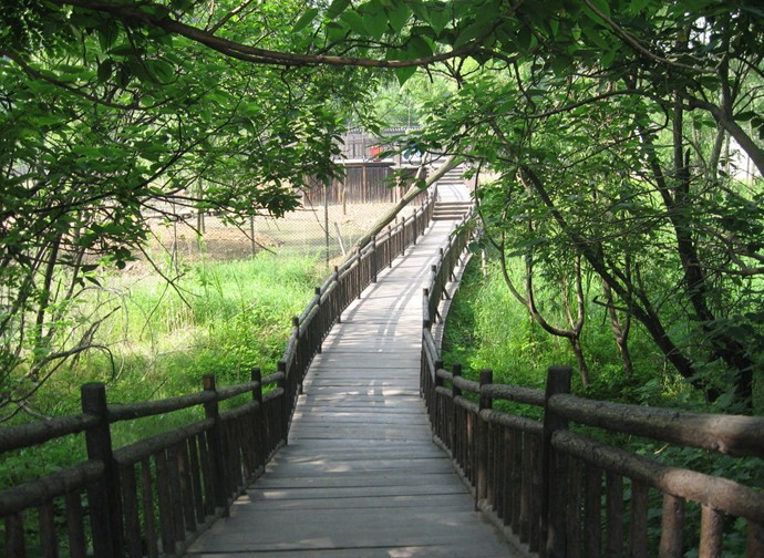 進入景區(qū)大門映入眼簾的是一座傍依古運河畔仿樹樁造型的曲橋,橋長百米,橋曲形美,橋韻古樸。每當(dāng)夏季來臨,滿塘荷葉圓如蓋,清香四溢,花燦如霞。在曲橋的魚池中,放養(yǎng)著數(shù)萬條日本錦鯉和其它觀賞金魚,大的體寬如碗口,水光晃漾,令人陶醉。
