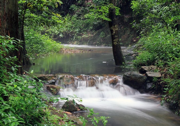我沿這條溪流上行,是從龍井開始的。 溪流是流經萬山叢中而來的。這些山并不陡峭卻很多溝壑,山腳相互交叉,樹木叢生,茂盛蒼翠,看不清上山的路徑。沿著溪流找山路,看見東邊又看不見西邊;前面象是路阻斷了,走上去卻發現有路。凡是水沒有流進溪的都叫做澗,一共有十八條澗,正好是九條溪的一倍。
