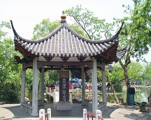 從島北碼頭上岸,經過先賢祠等兩座建筑,即步入九曲平橋,橋上有開網亭、迎翠亭、花架亭、御碑亭,康熙御碑亭,我心相印亭四座造型各異的亭子,讓人走走停停,歇歇看看,或談笑,或留影,流連觀照,飽覽美景。九曲橋東,隔水與一堵白粉短墻相望。墻兩端了無銜接,形若屏風。但粉墻上開啟四只花飾精美的漏窗,墻內墻外空間隔而不斷,相互滲透。墻外游人熙熙攘攘,墻內卻幽雅寧靜,咫尺之間兀自大異其趣。尤三潭印明月的景觀享譽中外。三潭印月園地是明萬歷三十五年(公元1607年)以湖泥堆積而成,周圍環形堤埂筑于萬歷三十九年。清雍正五年(公元1727年),南北連以曲橋,東西系以柳堤。面積7公頃,俯視呈田字形,素以“湖中有島,島中有湖”的水上園林而著稱。洲上有“開網”、“亭亭”、“迎翠”、“閑放”、“我心相印”等亭、榭、樓、臺,石橋曲折有致,漏窗空靈深遠,花木扶疏,倒影迷離,置身其間,有一步一景,步移景異之趣。