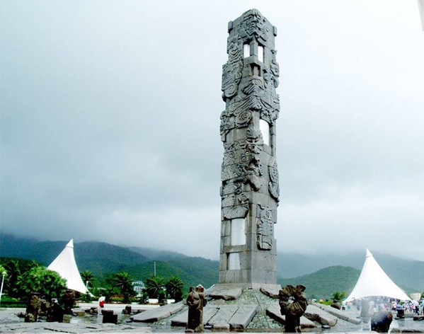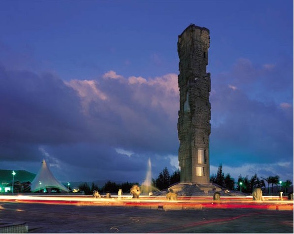 亞龍灣中心廣場,位于三亞市東南28公里處。廣場以圖騰柱向藍天升騰,以雕塑群向大地和大海延伸,其宏偉氣勢和獨特的藝術造型,以有限的藝術空間形式,引導我們的想象向無限的空間擴展。廣場外圍設計的五組白色風帆式的尖頂帳篷及大型彩色噴泉,給具有古老文化意蘊的雕塑增添了現代氣息。