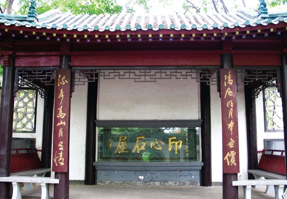 到游覽,進大門,過小院,出茶院右門,迎門是置于黃瓦紅柱內的清道光皇 帝御書“印心石屋”照壁,用陰陽筆法刻鐫而成,遠看凸突而出,近看凹陷而入。照壁東側有一小門,門額“琴臺”二字,據傳出自北宋著名書法家米芾之手。再往前便是琴堂,又名友誼堂,是一棟半檐歇山頂式前加抱廈的殿堂,面寬三間,四周回廊,磚木架屋,釉瓦蓋頂,彩畫精麗,金碧輝煌。檐下匾額上書“高山流水”四字。