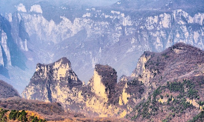 茱萸峰,俗名小北頂,峰頂有真武大帝廟、天橋、云梯。相傳,王維名詩《九月九日憶山東兄弟》:“獨在異鄉為異客,每逢佳節倍思親,遙知兄弟登高處,遍插茱萸少一人。”即于此峰有感而作。登上峰頂,極目遠眺,可見黃河如銀帶;俯視腳下,群峰形似海浪涌。山頂氣候多變,倏忽間風起云生,白霧從山間咕嘟嘟地涌出,紅日隨即隱去。山峰在云霧中出沒,云騰山浮,如臨仙界。峰腰有藥王洞,深30米,直徑10米,相傳是唐代藥王孫思邈采藥煉丹的地方,藥王洞口有古紅豆杉一株,高約20米,樹干粗達三人合抱,枝繁葉茂,樹齡在千年左右,是國內罕見的名木。另有“廚灶洞”、“閻王洞”、“黃泥洞”等十余個洞穴。景點內的名泉一斗水,泉狀若小井,水涌平地面,終年不涸不溢。另外,杜鵑峰、浮丘峰、翠微峰、云門峰也都各具特色。