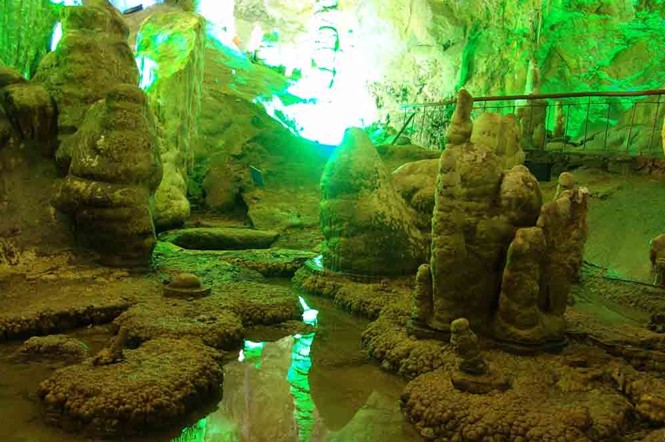 下一個觀景點可選第六景區的攝影臺,沿途會看到石筍或如猴子、或如小狗、或如白鴿散布路旁,極富情趣。尤其是路中間稱為“絆腳石”的石筍,據說舉步跨過便可平步青云,步步高升。在“絆腳石”右側,還有一根根片狀鐘乳石與地面相連,構成整體寬3.2米,高2米的石琴,排列整齊細密,以石輕擊可發出悅耳動聽的聲音,琴音清脆,余音裊裊。版權所有山東聊城聊之旅國際旅行社有限公司,轉載必究!當站在攝影臺上,最搶眼的景觀是一根龐大的石柱,經測定石柱形成時間約500萬年,柱身自然形成精妙絕倫的浮雕圖案,似金龍倒盤,龍頭、龍身、龍尾、龍爪清楚可辨,被命名為“盤龍玉柱”,因其雄偉高大,形成時間漫長,龍形圖案逼真國內獨一無二,被權威稱為“中華第一柱”。