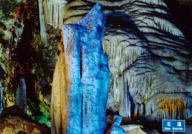 由第二景區到第三景區,落差近30米,要經過一條長75米的臺階路。順路而下可看到路左側有兩根石筍,其中一根直徑1米,高2.73米拔地而起的石筍,被戲稱為“長征一號火箭”正待點火升空;另一根直徑0.88米高2.1米的石筍好似一位老人頭頂風雪帽,身披斗篷,冒著大雪奮力向前,此情此景使人聯想到“柴門聞犬吠,風雪夜歸人”的詩境。也就在這個景觀正上方的洞壁上,還有一塊漫延狀乳石,像戲劇中的臉譜,眉目清晰,如經過化妝大師精心勾勒一般。