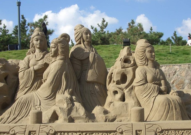 2004年第六屆中國舟山國際沙雕節以"至愛永恒(Love Forever)"為主題,以"愛漫人間"、"華夏戀曲"和"西方情緣"為分主題。每組作品由若干個單體組成,或分散或連接,通過"愛"的內在脈絡有機結合,版權所有山東聊城聊之旅國際旅行社有限公司,轉載必究!營造出了一個"愛的大觀園"。本屆沙雕節的沙雕展區長250米,寬55米,用沙量達2萬多立方米,規模空前,是歷屆之最。沙雕展區的現場布局呈花園式分布,改變過去單一式的進出口布局,整個游覽線路曲徑通幽,按園林式設計。本屆沙雕節在沙雕作品上首次實施人工造霧、造水,使人物、樓臺、山景等形象更加逼真。本屆沙雕節首次邀請著名節目主持人李湘為沙雕節形象代言人,由李湘來宣傳沙雕、推介沙雕。