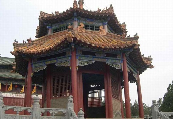 大殿前筑有3米高的月臺,周圍有石雕欄桿,月臺正面有三道石階。中間的臺階分二路,二路間鑲有垂帶式“御路”一石,上面浮雕著精美的圖案,上截為“獨龍盤踞”,中間為“雙龍戲珠”,下邊為“群鶴鬧蓮”等紋飾。月臺下面為拜臺,左右為兩座秀麗的御碑亭,東為“御捍亭”,內立乾隆十五年(公元1750年)的御碑,西為“御帛亭”,內立乾隆四十八年(公元1783年)的御碑,其字乃草書,筆勢如箭,揮灑淋離。