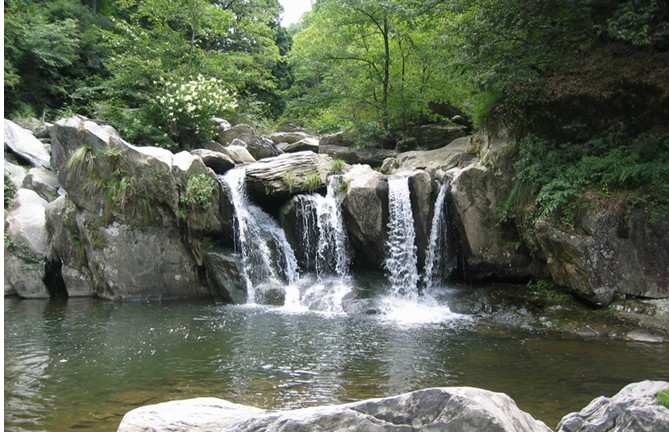 從黃龍潭瀑布向下走上幾百米,然后再向西北方向溯另一小溪上行,不一會兒就可到達烏龍潭瀑布。只見瀑布從幾塊巨石中奪路沖出,分成三股,只有數米高,然而姿態十分優美。那一股股水流,跌落水中,發出婉轉悠揚的樂音;那烏龍潭水,清澈透明,惹人喜愛。游人至此,不禁會體會到“山不在高,有仙則名,水不在深,有龍則靈”的含意。