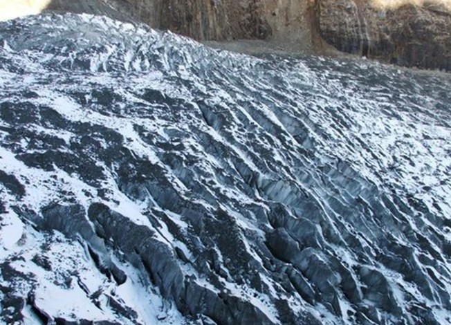 1號冰川冰舌中段兩側的石英片巖谷壁上的冰川磨光面,高20米(南岸)與50米(北岸),布滿不同傾角組合的刻痕,版權所有山東聊城聊之旅國際旅行社有限公司,轉載必究!括痕和刻槽,甚至反向(傾向上游)刻痕、刻槽,最大的一道刻槽深1.8米、高3.8米以上。