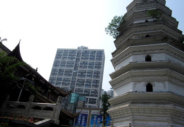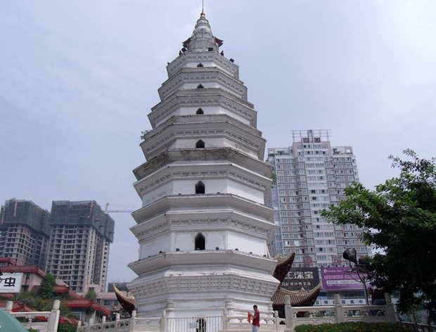 報恩塔,俗稱“白塔”,四川省文物保護單位,位于瀘州城區。建于南宋紹興十八年(1148),明弘治年間、清光緒四年、1985年三次維修。塔坐西向東,磚石結構,雙檐七級樓閣式,通高33.2米。塔身呈八邊形,層層上收,107級踏道經塔心盤旋至頂,塔內90龕256尊深浮雕石刻造像,人物線條流暢,栩栩如生。塔基為八邊形,邊長4.1米。