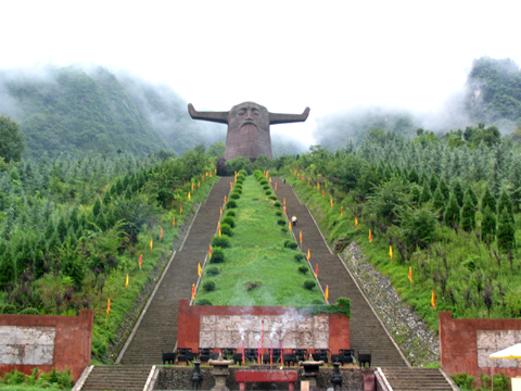 神農(nóng)架據(jù)傳是華夏始祖、神農(nóng)炎帝在此搭架采藥、療民疾矢的地方。他在此“架木為梯,以助攀援”,“架木為屋,以避風(fēng)雨”,最后“架木為壇,跨鶴升天”。神農(nóng)炎帝是華夏文明開創(chuàng)者之一,后人將其豐功偉績列陳有八:訓(xùn)牛以耕,焦尾五弦,積麻衣革,陶石木具,首創(chuàng)農(nóng)耕,搭架采藥,日中為市,穿井灌溉。為緬懷祖先,頌其偉業(yè),林區(qū)人民政府于1997年開始在神農(nóng)架主峰南麓小當(dāng)陽興建神農(nóng)祭壇一座,塑其雕像于群山之中,但見牛首人身的神農(nóng)氏雙目微閉,似思似眠,神農(nóng)塑像與千年古樸相擁而立,景致渾宏,氣宇不凡,蔚為壯觀。