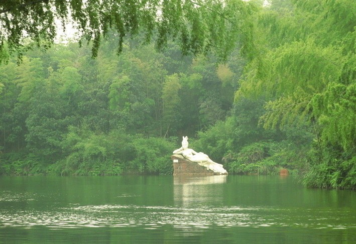 伐舟湖心,清涼的風使人身心爽暢。竹筏揚起的清清碧波,層層漣漪,漫連著四周碧的蕨綠的竹。湖的深處,瑤箐仙子正臨波浴身,她那流瀑般的秀發輕柔地披散在萬點柔光的碧波中,一雙白皙而修長的胳膊正掬起一抔瓊漿澆灑在秀美的臉頰上,珍珠般的水在她如雪似玉的肌膚上滾動,熠熠生輝。岸邊,臨水而建的竹亭、竹廊、竹寨,在翠竹的掩映下,絢麗多彩。