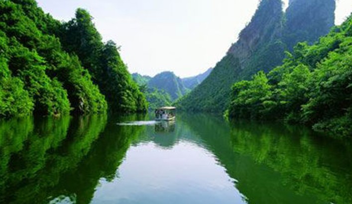 湖中有兩座疊翠小島,近岸奇峰屹立,峰回水轉。泛舟漫游,只見一湖綠水半湖倒影,充滿詩情畫意。“云梯萬丈上天臺,高峽平湖一鑒開,王母瑤池金扶,浣沙仙女下凡來”游寶峰湖,你就會欣賞到這樣的詩情畫意。群峰擁抱的寶峰湖,長約2.,5公里,湖猶如一面寶鏡,四面青山,一泓碧水,蕩槳溫游,格外愜意。坐在船上,環顧四周,千山聳翠,俯視水中,倒影慢移,碧水照相館得群峰綠,人面桃花水映紅。真是靜極了,美極了!韓劇《九天洞》拍攝的湖水就是寶峰湖。