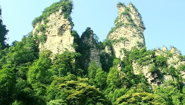 十里畫廊山清水秀,繁花似錦,百鳥爭鳴。境內景物造型奇特:若人,若神,若仙,似林,似禽,似獸的石英砂巖峰林在云霧中時隱時現,變化萬千。早在明代就有人寫下“人游山峽里,宛如畫圖中”等佳句。大自然這位雕塑大師,以鬼斧神工之國,在十里畫廊塑造了稀世珍品,它是藝術的世界,童話的世界和神秘的世界,為中外游客叫絕。