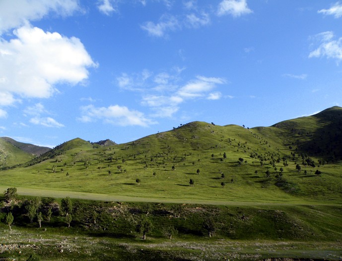 駐足柴達木政治經濟文化中心--海西蒙古族藏族自治州首府德令哈市街頭,向北眺望,群山起伏,層巒疊嶂,像一彎新月,環抱著這座瀚海新城。山勢嶙峋,危崖林立,滿山遍野的古柏蓊翳,把袒胸露腹的高原山脊丘壑裝飾得崗翠峰黛,如青龍橫臥,展示出一種博大粗獷、氣勢磅礴的綠。這豪邁而深沉的蒼巒翠嶂,就是德令哈勝景之一的柏樹山。