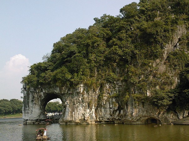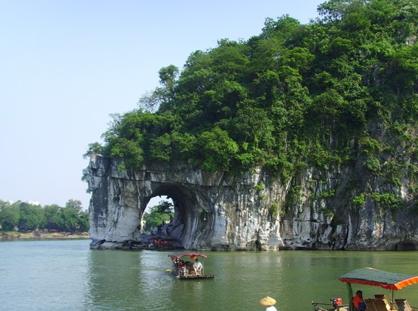 在桃花江與漓江匯流處,版權(quán)所有山東聊城聊之旅國際旅行社有限公司,轉(zhuǎn)載必究!西距文昌橋200米。海拔200米,高出江面55米,長108米,寬100米,山體面積1.3公頃。由3.6億年前海底沉積的純石灰?guī)r組成,酷似一頭巨象伸長鼻子吸飲江水。象鼻山原名漓山,又名宜山、儀山、沉水山,簡稱象山。象山以神奇著稱。其神奇,首先是形神畢似,其次是在鼻腿之間造就一輪臨水皓月,構(gòu)成“象山水月”奇景。因此,象山成了桂林山水的代表、桂林城的象征,桂林乃至廣西地方產(chǎn)品多以象山作為標(biāo)記。