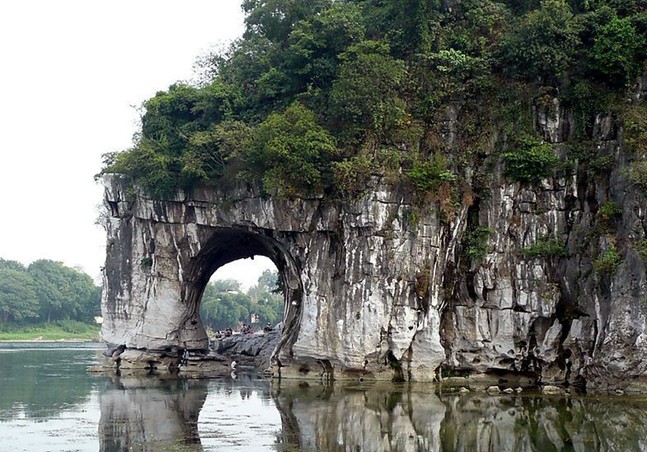 象鼻山又稱象山。明代詩人孔鏞寫道:“象鼻分明飲玉河,西風(fēng)一吸水應(yīng)波。青山自是饒奇骨,白日相看不厭多。”這一百看不厭的象鼻山位于城南漓江和桃花江的江流匯合處。山形酷似一頭巨象,伸長鼻子臨江吸水,因而得名。
