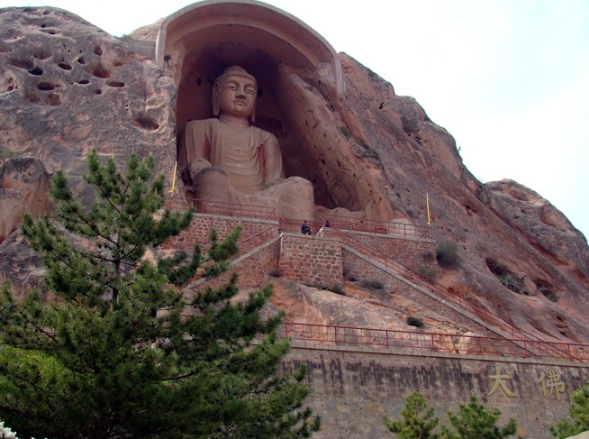 最為引人注目的,是須彌山入口處高達20.6米的彌勒大座佛。它高坐于唐代大中三年(849年)開鑿的一個馬蹄形石窟內(nèi),身披袈裟,頭流螺髻;臉如滿月,雙耳垂肩,神情莊重,十分壯觀。這座大佛比云崗石窟中最大的十九窟坐佛和龍門石窟的奉先寺盧舍那佛還高,是全國最大的造像之一。走近觀察,只見那佛高大魁梧,足有五六層樓高,耳朵有兩人高,眼窩直徑1米多,佛雖大,但雕刻卻十分的精致。專家說,這完全是一塊完整的罕見巨石雕琢出來的,充分顯示了中國古代工匠的高超技藝和雄偉氣魄。唐代統(tǒng)治者提倡佛教,武則天曾下令全國各州建大佛寺,造大佛像。有學者推測,這等大佛可能是在武則天掀起的崇拜佛的浪潮中建造的。站在大佛的腳下,眼前似有云霧繚繞,耳旁隱聽山泉叮咚,山石霧松組成大西北黃土高原上獨特的山水畫卷