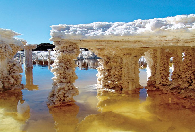 驅車行進一段之后,司機師傅突然將車停下說:“萬丈鹽橋到了。”筆者一行急忙跳下車去,爭睹這遠近聞名的人間奇觀。可乍看之下,鹽橋不過是一條普通的公路而已,和想象中的樣子相去甚遠。經介紹才知道,其實這條路是懸浮的,全由鹽晶筑成在湖面上,足有幾米厚,并與周圍自然結成的鹽蓋連成一體,像是在平常的陸地上。鹽橋全長32公里,折合市制可達萬丈,因此而得名。有意思的是,路面的維修方法十分獨特,如果發現哪里有坑坑洼洼,只需從路邊鏟一點鹽來填平,再灑一點鹵水就平整如初了。