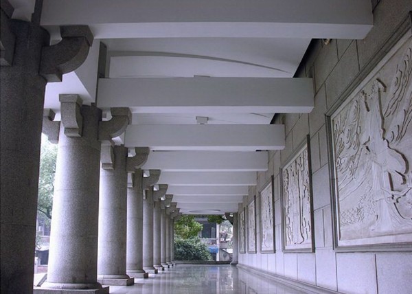 新館用融合的方法處理新舊建筑的關系,以原陳列大樓為中心,圍合前庭,強化兩翼,對稱布局,形成三殿式建筑,集簡練、穩重、統一于一體,秩序感極強。