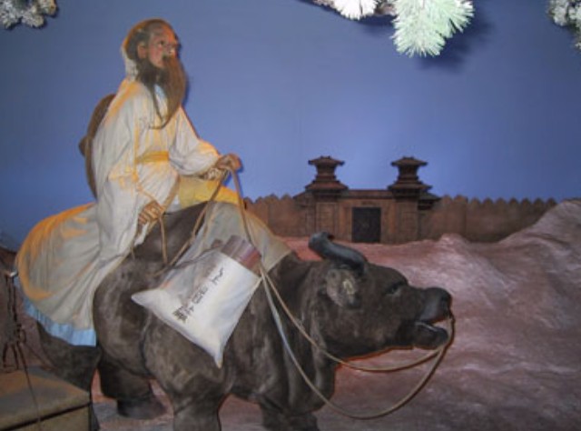 來到我國著名思想家,道德學派創始人,安徽渦陽人的老子展位,只見騎在青牛背上的老子,白發蒼蒼,目光炯炯有神,正緩緩向前走來,他身旁是挑著行囊的書童。隨著呼嘯的風聲,天空飄起了鵝毛大雪,轉眼間便白茫茫一片,眼前“秦界”,函谷關依稀可見。老子手中握著的牛繩一起一落,青牛不斷發出“哞哞”的叫聲,正向函谷關進發,準備西去流沙。由于展區內的人物、景物采用了光電技術,人物與場景均十分逼真。