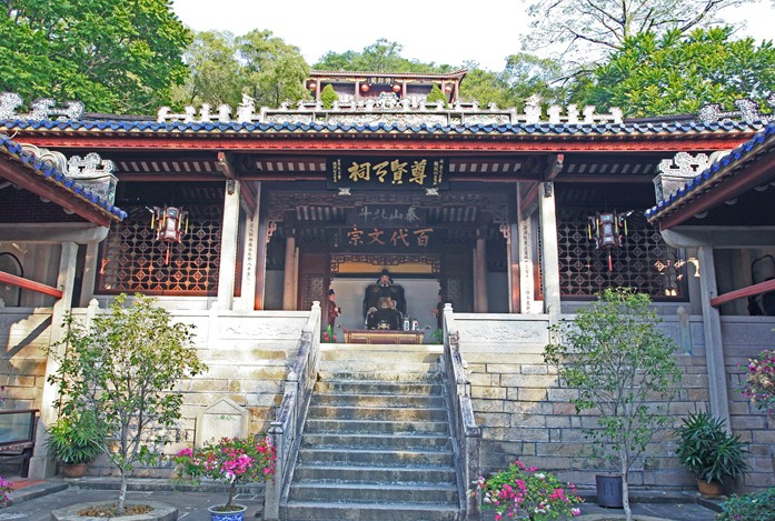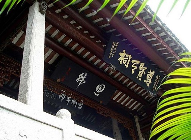 韓祠正門,上面寫著“韓文公祠”四字,是1984年胡耀邦總書記視察潮州所留下的手跡。韓祠依山而建,層次分明,前落是韓祠的主體,后落是侍郎閣,現在我們拾級而上,石階一共有51級,是紀念韓愈51歲時到潮州。韓祠前原有韓愈手植橡木,民間傳說:橡木開花的多少,可以預示當年科舉考試錄取率的高低。韓祠橡木后來成為潮州八景之一。