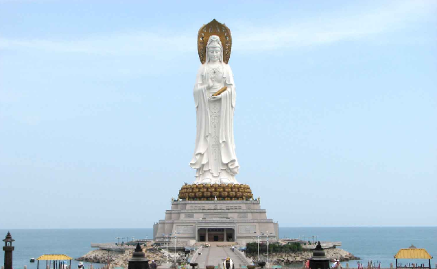 三亞南山海上觀音圣像敬造工程因其規模宏偉、意義殊勝、佛理底蘊豐富,被譽為“世界級、世紀級”的佛事工程。像體為正觀音的一體化三尊造型,寶相莊嚴,腳踏一百零八瓣蓮花寶座,蓮花座下為金剛臺,金剛臺內是面積達15000平方米的圓通寶殿。金剛洲由長280米的普濟橋與陸岸相連,并與面積達60000平方米的觀音廣場及廣場兩側主題公園,共同組成占地面積近30萬平方米的“觀音凈苑”景區。